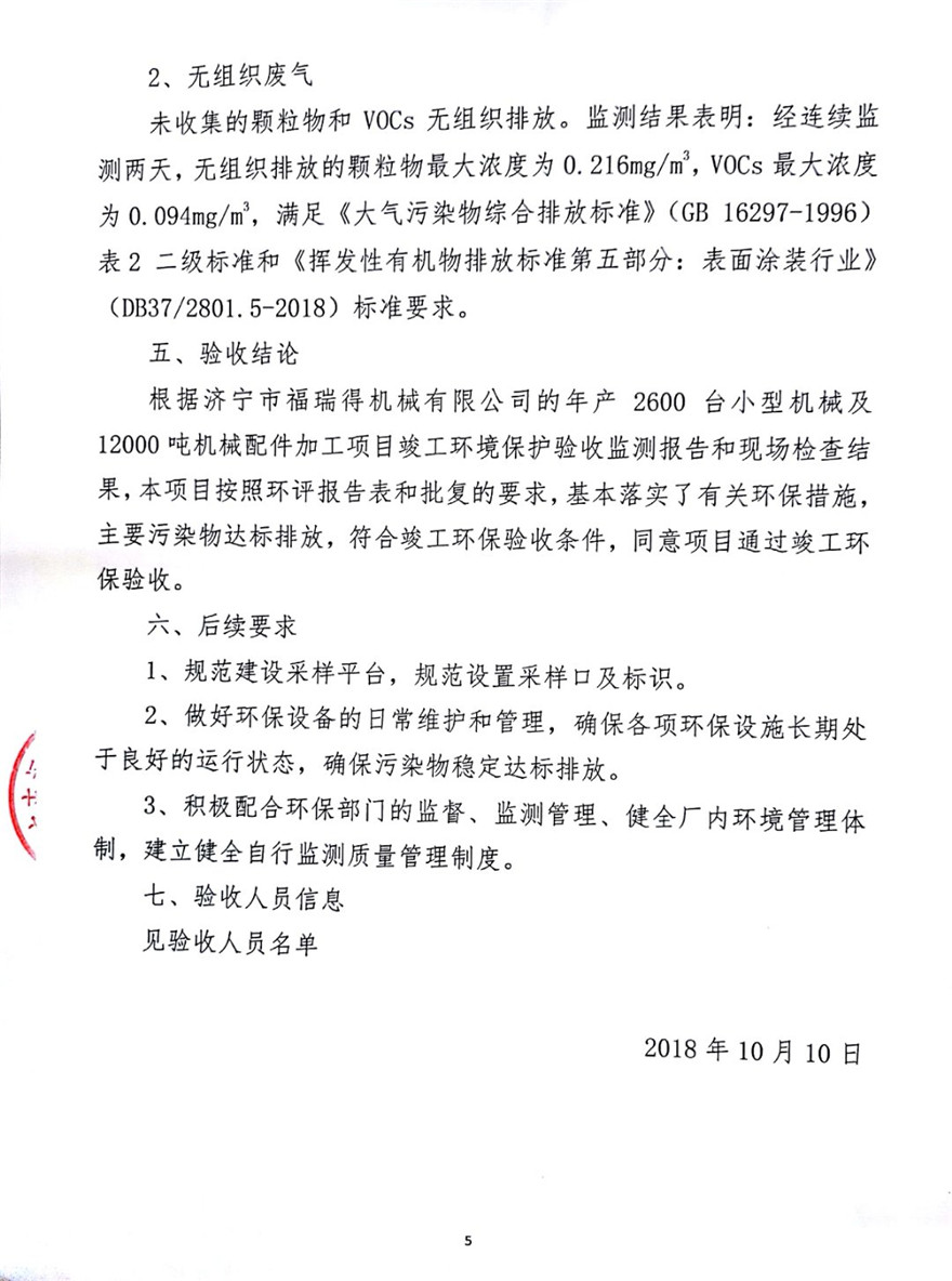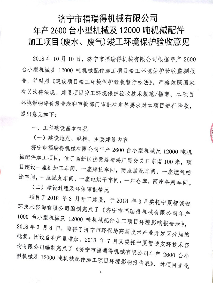 年产2600台小型机械及12000吨机械配件加工项目(废气、废水)竣工环境保护验收意见