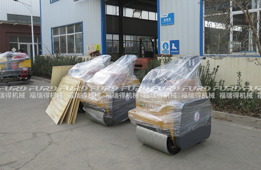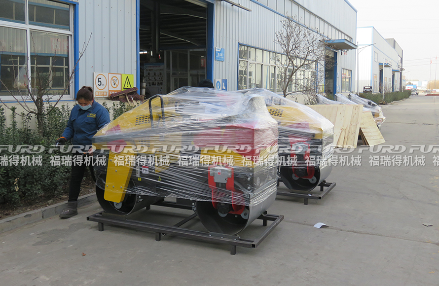 1月18日,福瑞得机械3台手扶双轮压路机和两台座驾压路机打包装箱出口新加坡。
