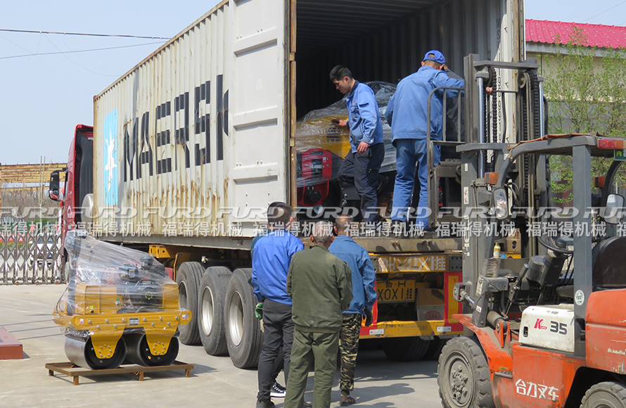 4月9日,福瑞得机械13台手扶双轮压路机,1台8吨重型压路机和2台座驾双钢轮压路机分两柜出口印度,这是福瑞得机械2021年度第8次大批量装柜出口压路机。