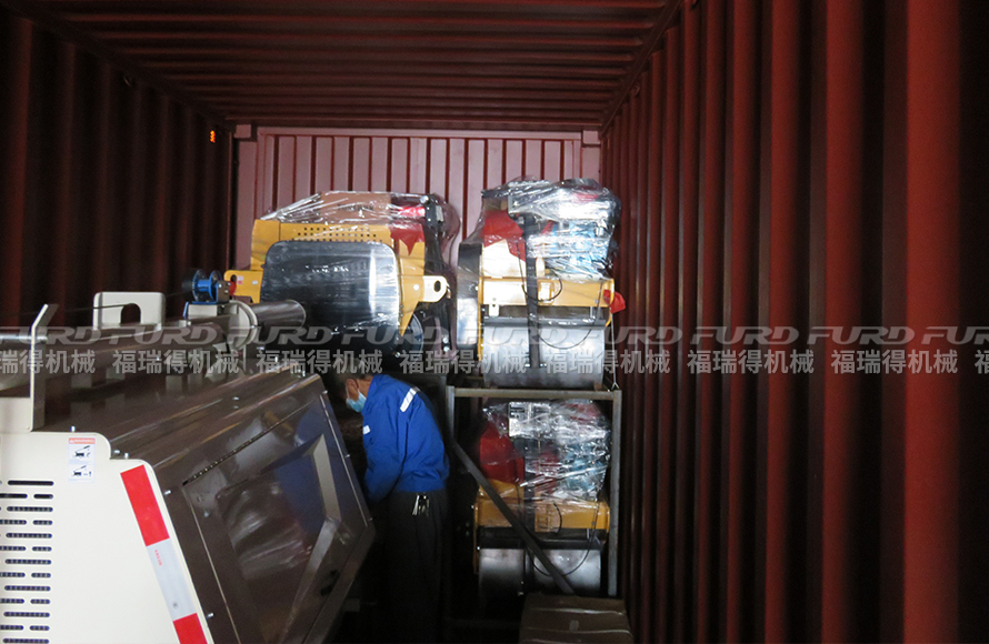 福瑞得机械压路机和移动灯车打包装车出口非洲