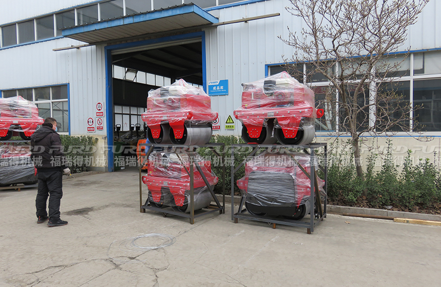 福瑞得8台小型双钢轮压路机打包装车发往临沂