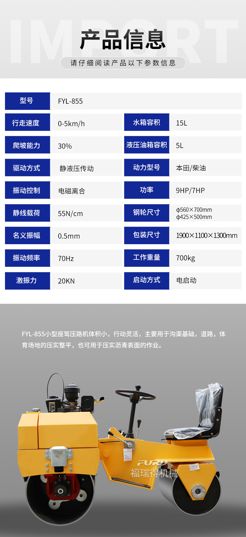 主要用于沟渠基础,道路,体育场地的压实整平,也可用于压实沥青表面的作业。