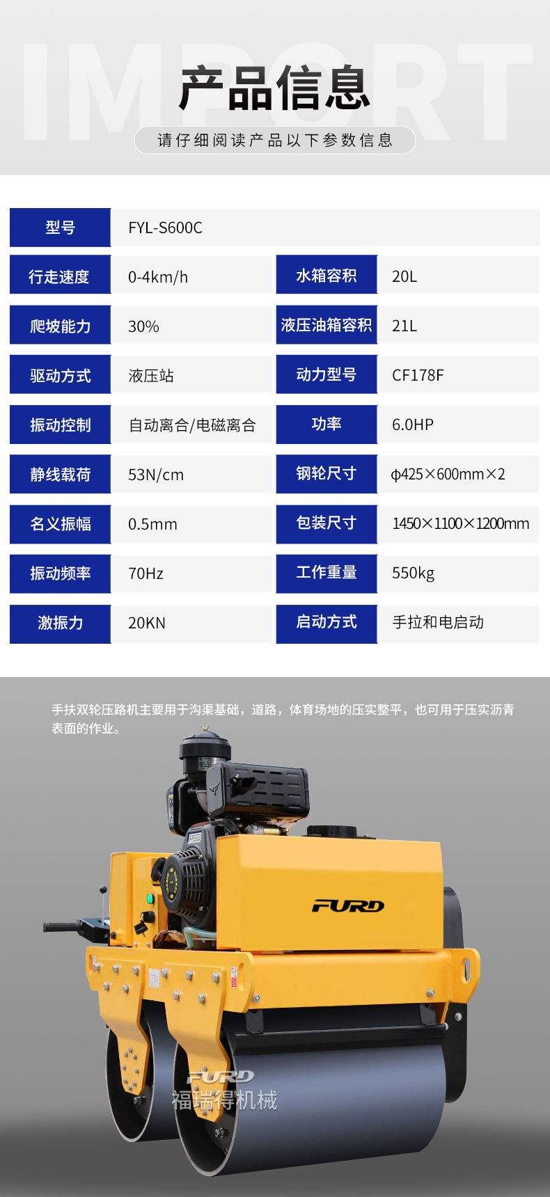 主要用于沟渠基础,道路,体育场地的压实整平,也可用于压实沥青表面的作业。