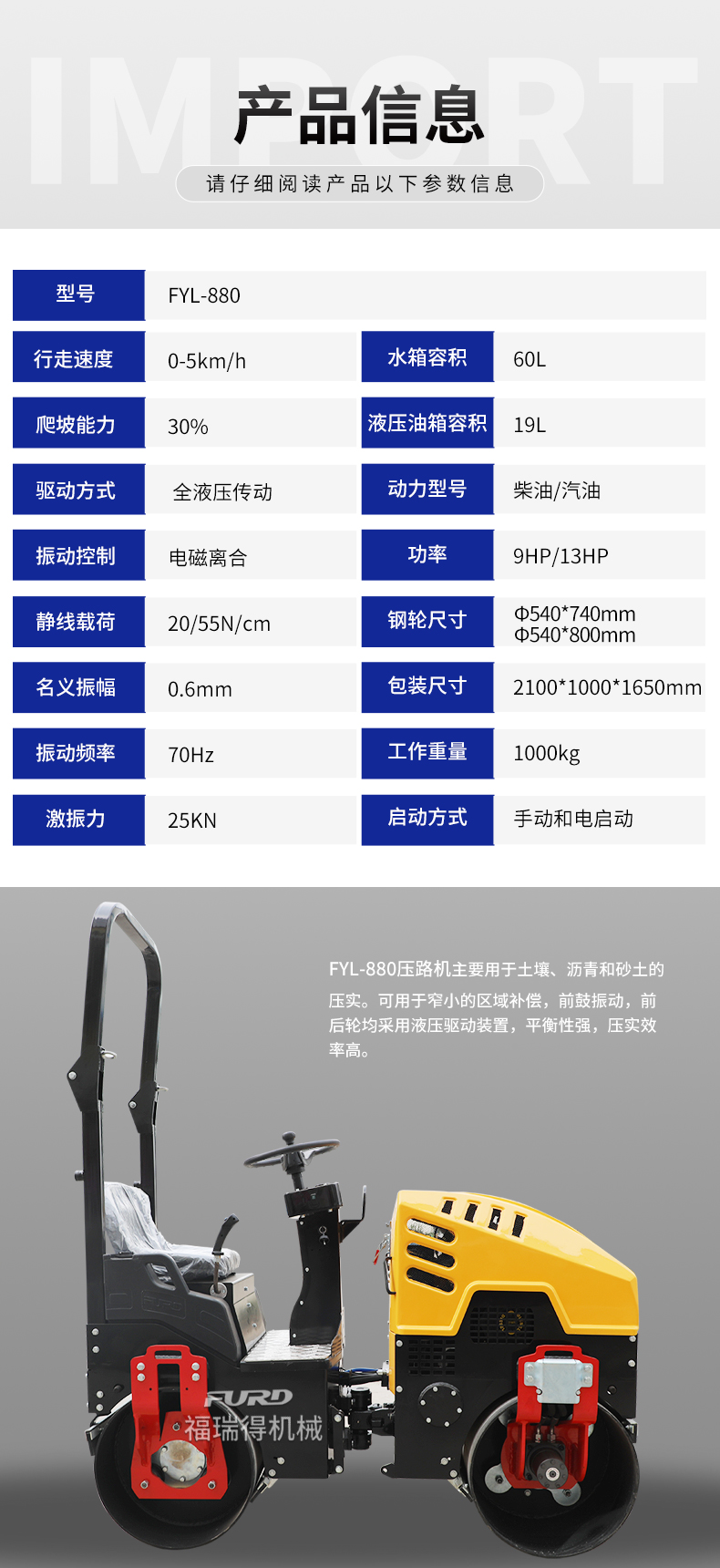 主要用于沟渠基础,道路,体育场地的压实整平,也可用于压实沥青表面的作业。