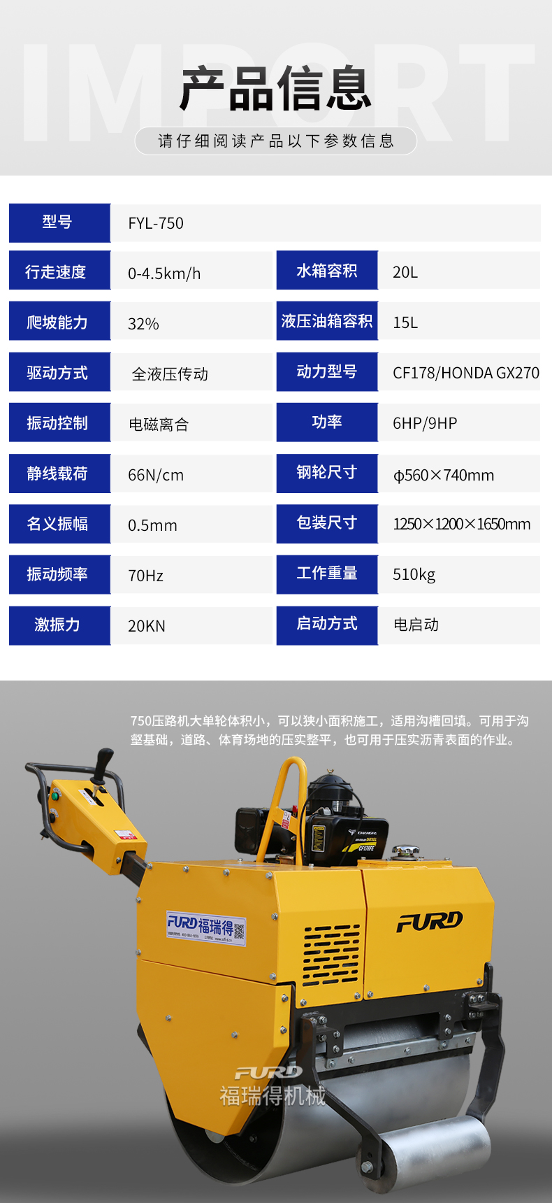 FYL-750 液压手扶式单轮压路机
