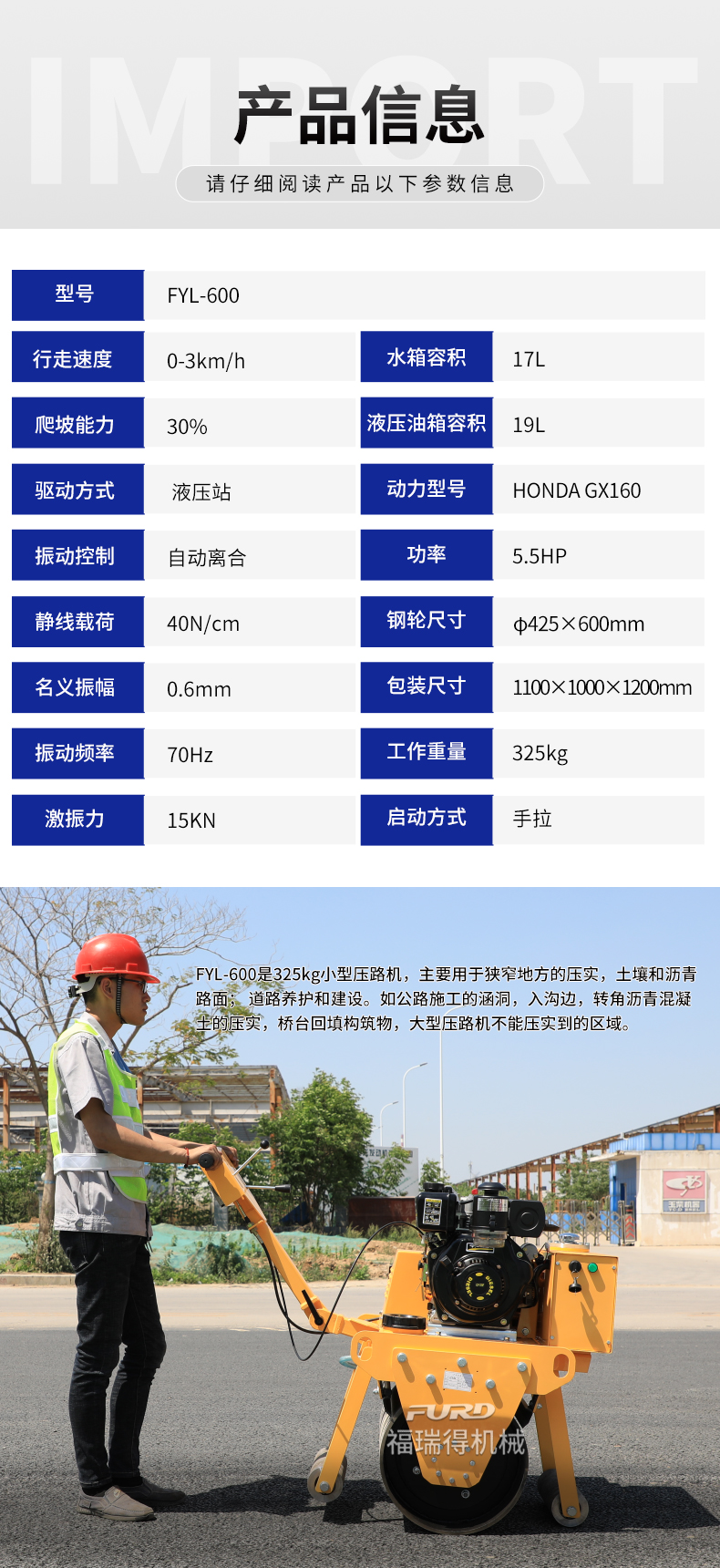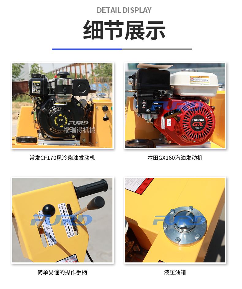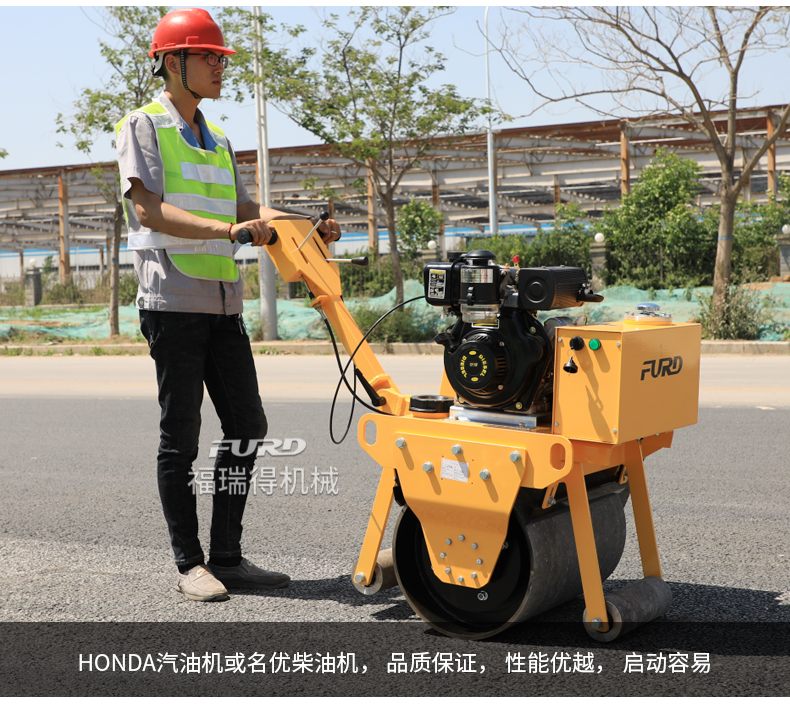 主要用于沟渠基础,道路,体育场地的压实整平,也可用于压实沥青表面的作业。