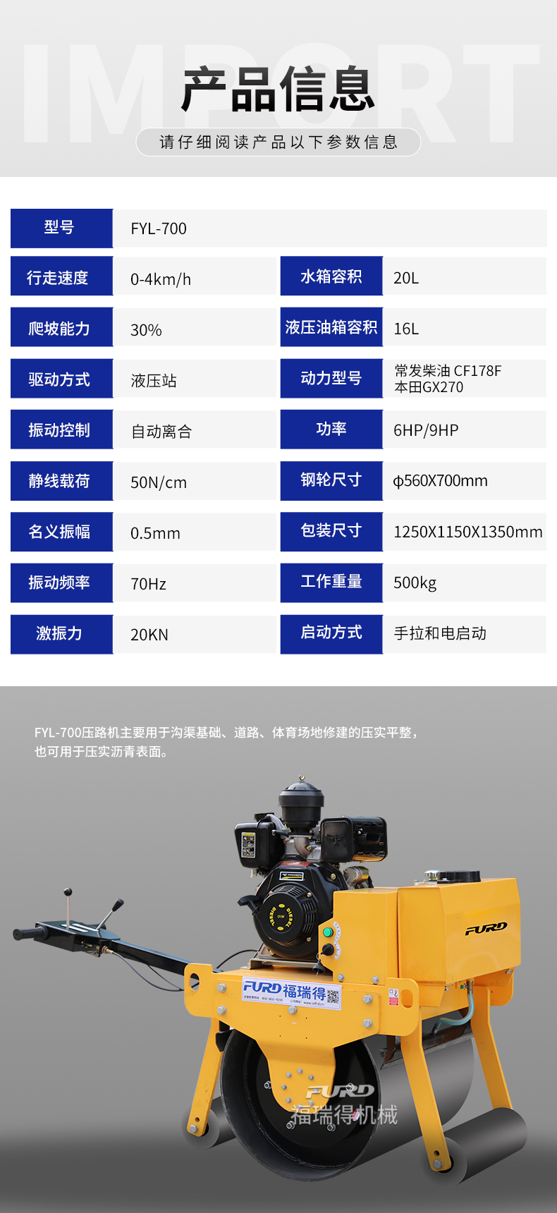 主要用于沟渠基础,道路,体育场地的压实整平, 也可用于压实沥青表面的作业。
