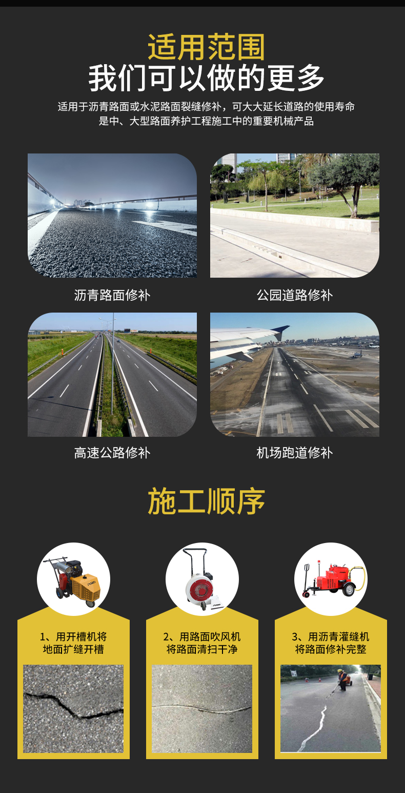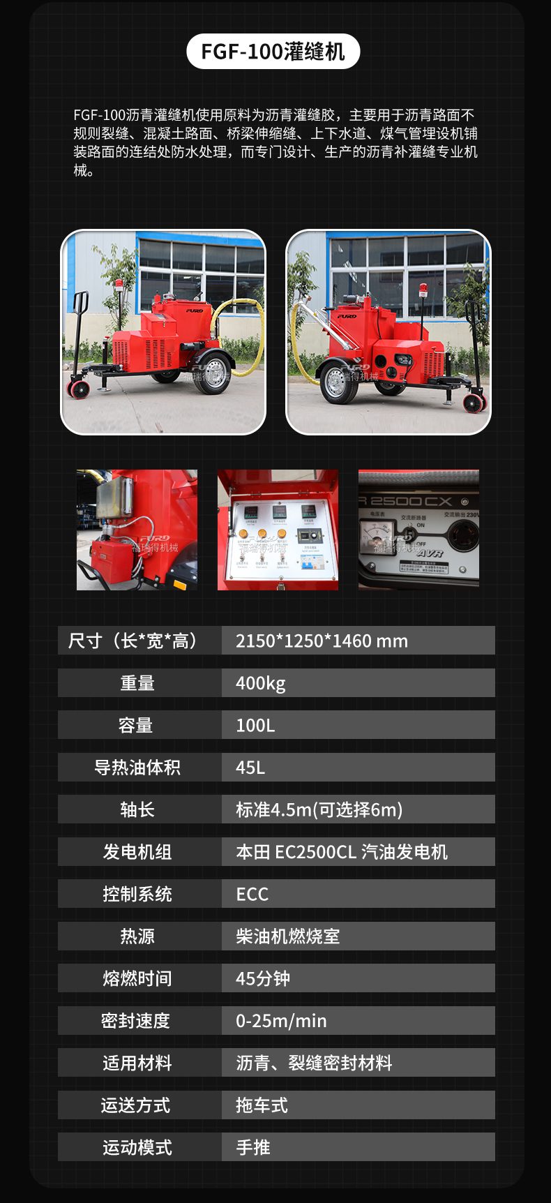 FGF-100沥青灌缝机使用原料为沥青灌缝胶,主要用于沥青路面不规则裂缝、混凝土路面、桥梁伸缩缝、上下水道、煤气管埋设机铺装路面的连结处防水处理,而专门设计、生产的沥青补灌缝专业机械。