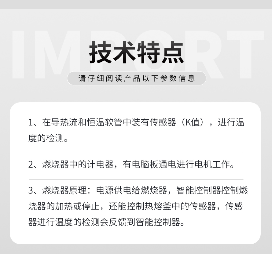 燃烧器原理:电源供电给燃烧器,智能控制器控制燃烧器的加热或停止,还能控制热熔釜中的传感器,传感器进行温度的检测会反馈到智能控制器。