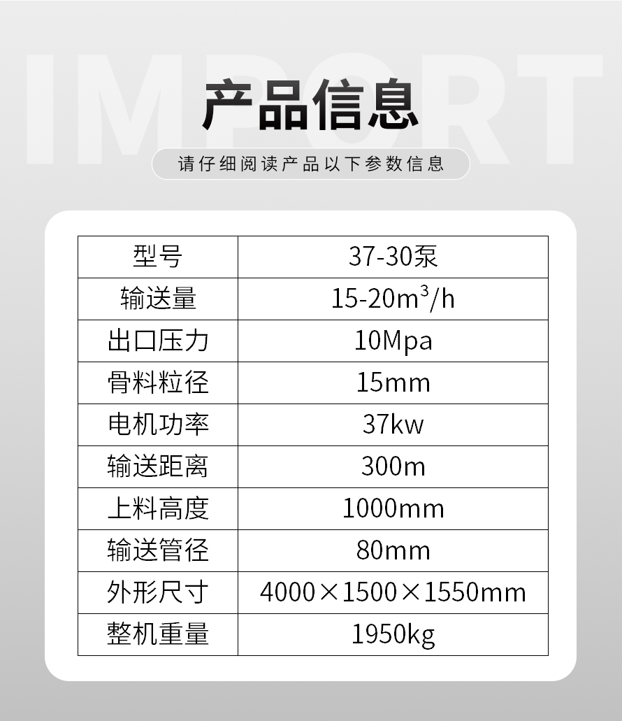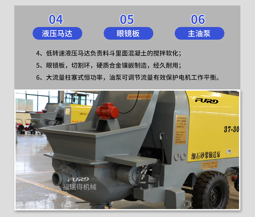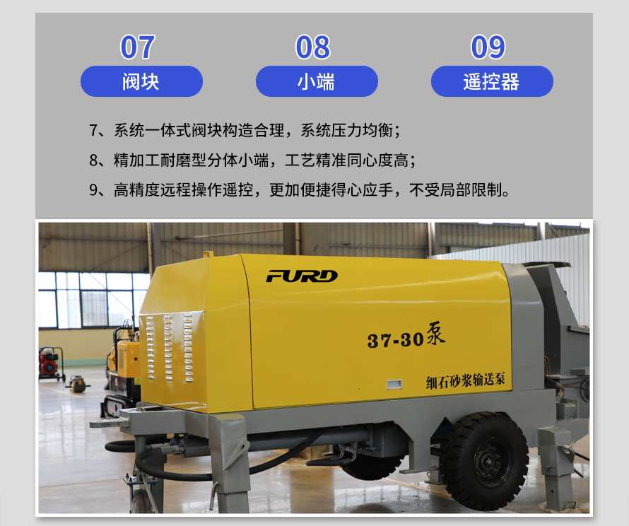产品介绍: 1,大流量 采用加粗料缸,让机械每一次循环出料多20% 2,效率高 移动便捷全部采用快接式管道卡,提高工作效率 3,便捷 本机可远程遥控,操作不受地点限制,更加人性化 产品用途: 坡道灌浆,水平地面,隧道浇筑,模