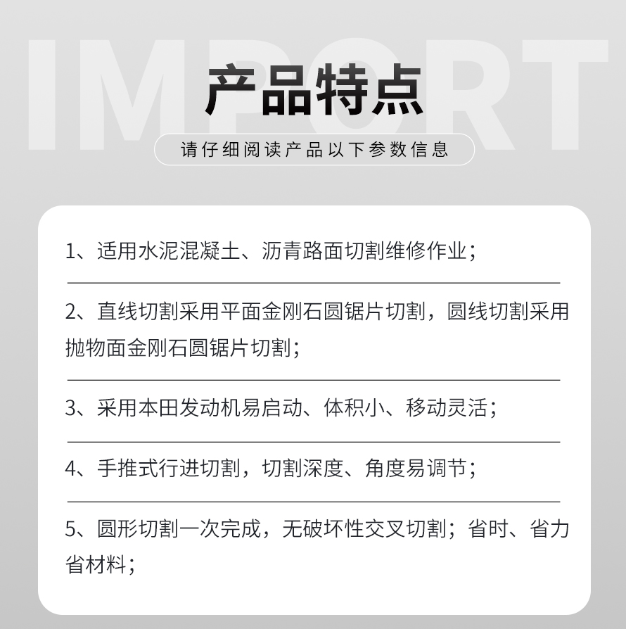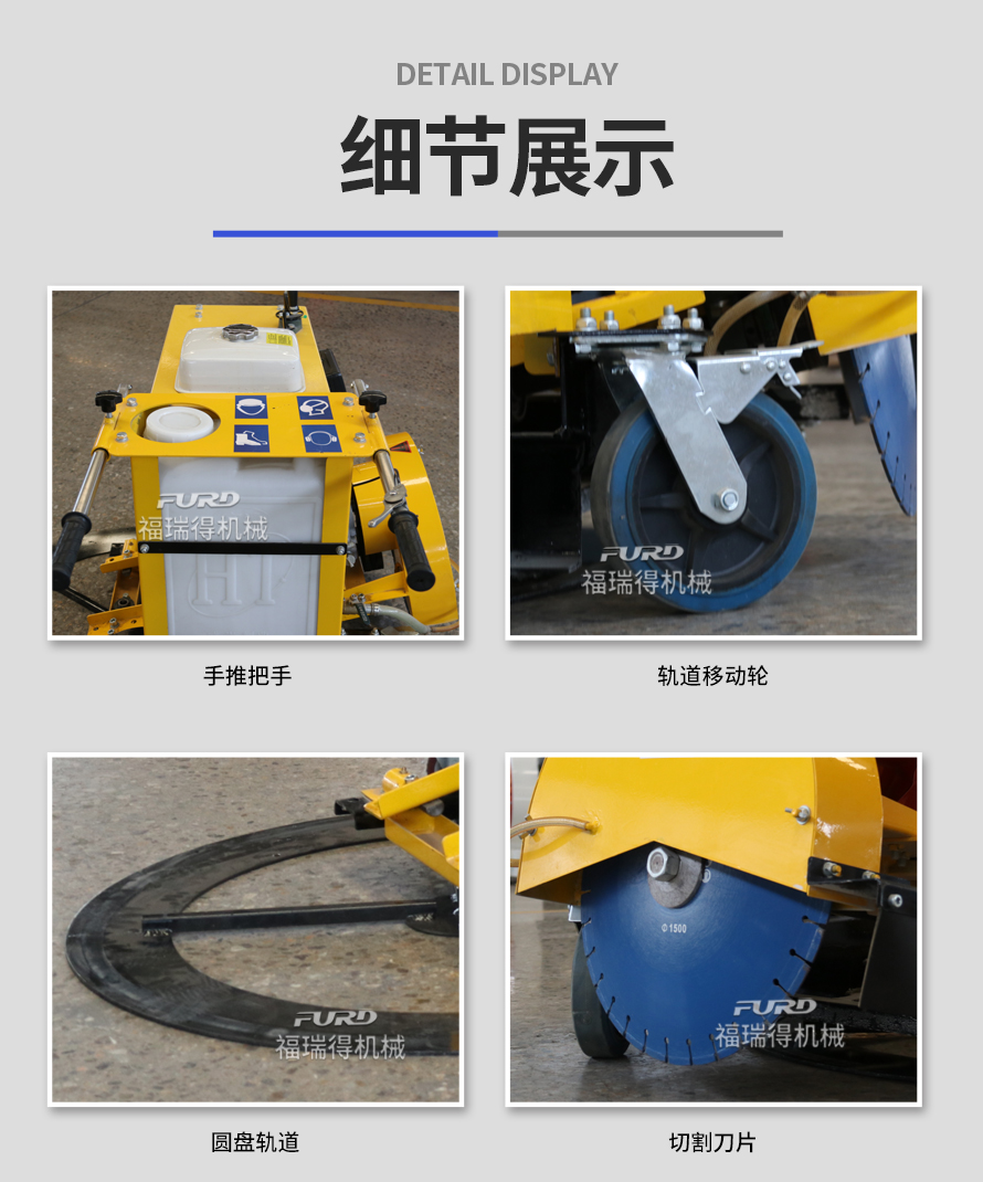 井周切缝机适合水泥混泥土、沥青路面切割维修;既可以做直线路面切缝机使用,也可以做圆形路面切缝机;独特的圆形切割能力省去了普通切缝机多次交叉破坏性切割的麻烦,效率是普通切缝机的10倍以上。