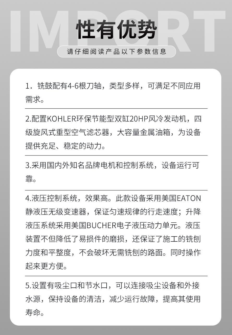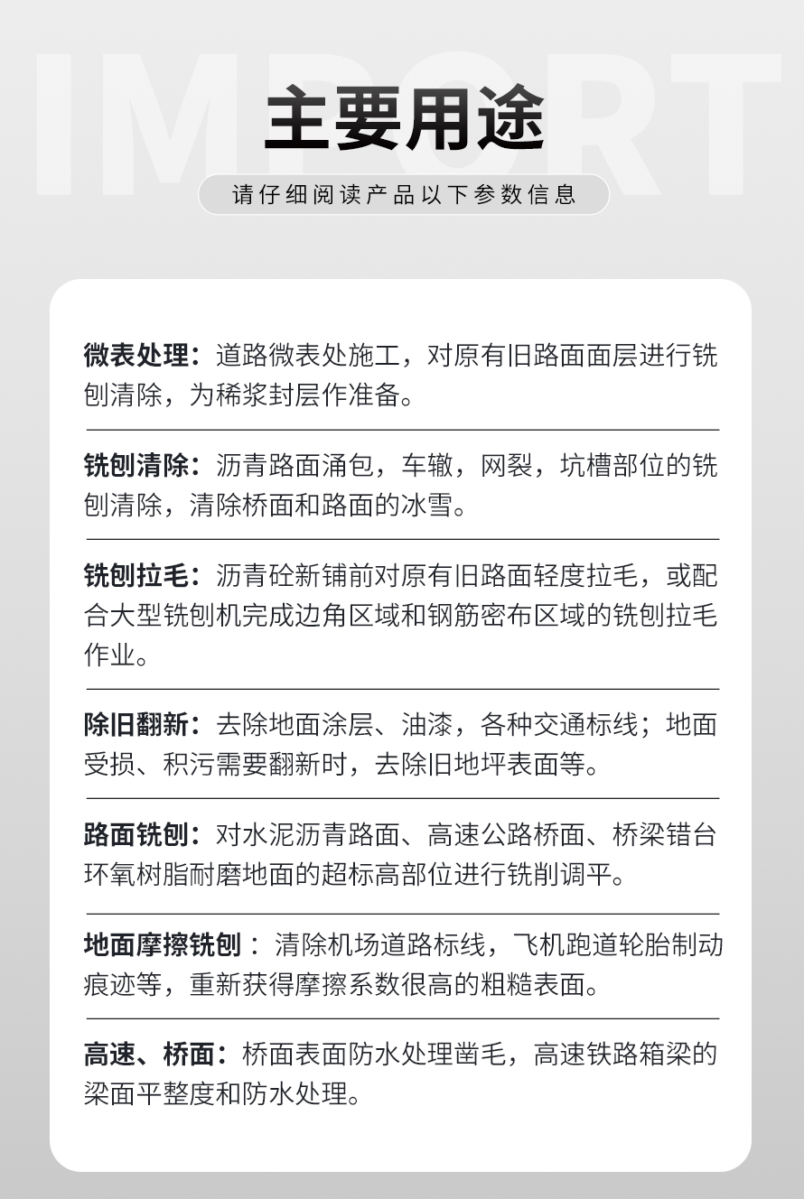 液压铣刨机结构紧凑,布局合理,具有控制精度高、性能稳定、操作简单、维护保养方便等优势。其适合各种强度较高的混凝土沥青等高出部分的去除工作,是其它类型的铣刨机无法替代的产品。