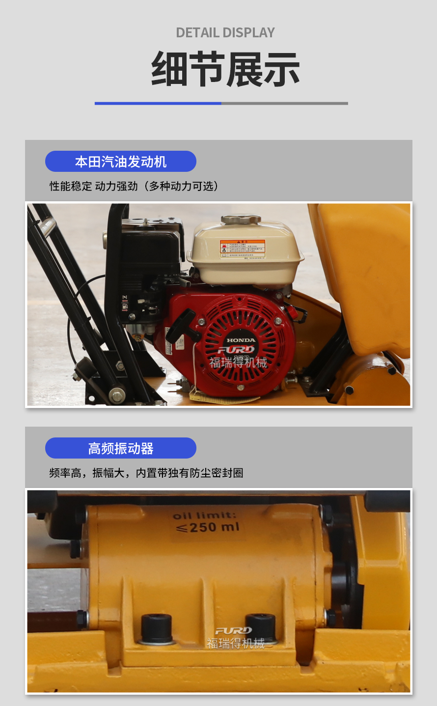 适用于路基边缘、桥涵、管道、沟槽底部等狭长地带的压实。 本田汽油动力,名牌品质保证。