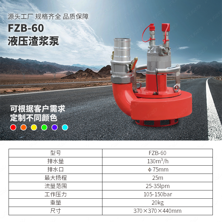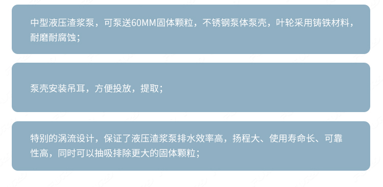 中型液压渣浆泵,可泵送60mm固体颗粒,不锈钢泵体泵壳,叶轮采用铸铁材料,耐磨耐腐蚀;